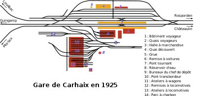 - Guingamp avec les lignes Plouha - Guingamp (1905 - 1939) et Guingamp - Saint-Nicolas-du-Pélem (1924 - 1938) des Chemins de fer des Côtes-du-Nord ;