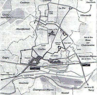 - D'après la Direction des transports et déplacements de la Communauté d'agglomération Marne et Chantereine, Syndicat intercommunal de transport du bassin chellois et des communes environnantes