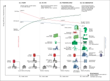 - nucléaire : chaleur produite par des centrales nucléaires conventionnelles en Russie, Suisse, Suède et Chine[6] et dans l'avenir, petits réacteurs modulaire à basse température et basse pression de type piscine[7],[8];