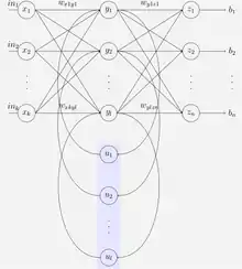 - est la matrice entre la couche d'entrée et la couche cachée, est la matrice entre la couche cachée et elle-même, est la matrice entre la couche cachée et la couche de sortie, et est le vecteur de biais (, , , et sont les paramètres)