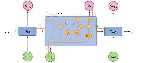 Un réseau Gated Recurrent Unit (GRU) (en français, réseau récurrent à portes ou plus explicitement réseau de neurones récurrents à portes) est une variante des LSTM introduite en 2014 par Kyunghyun Cho et al[10]. Les réseaux GRU ont des performances comparables aux LSTM pour la prédiction de séries temporelles (ex : partitions musicales, données de parole[11]). Une unité requiert moins de paramètres à apprendre qu'une unité LSTM. Un neurone n'est associé plus qu'à un état caché (plus de cell state) et les portes d'entrée et d'oubli de l'état caché sont fusionnées (update gate). La porte de sortie est remplacée par une porte de réinitialisation (reset gate).