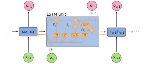 Un réseau Long short-term memory (LSTM), en français réseau récurrent à mémoire court et long terme ou plus explicitement réseau de neurones récurrents à mémoire court-terme et long terme, est l'architecture de réseau de neurones récurrents la plus utilisée en pratique qui permet de répondre au problème de disparition de gradient. Le réseau LSTM a été proposé par Sepp Hochreiter et Jürgen Schmidhuber en 1997[6]. L'idée d'un LSTM est que chaque unité computationnelle est liée non seulement à un état caché mais également à un état de la cellule qui joue le rôle de mémoire. Le passage de à se fait par transfert à gain constant et égal à 1. De cette façon les erreurs se propagent aux pas antérieurs (jusqu'à 1 000 étapes dans le passé) sans phénomène de disparition de gradient. L'état de la cellule peut être modifié à travers une porte qui autorise ou bloque la mise à jour (input gate). De même une porte contrôle si l'état de cellule est communiqué en sortie de l'unité LSTM (output gate). La version la plus répandue des LSTM utilise aussi une porte permettant la remise à zéro de l'état de la cellule (forget gate)[7].