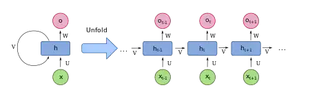 Les réseaux de neurones récurrents sont adaptés pour des données d'entrée de taille variable. Ils conviennent en particulier pour l'analyse de séries temporelles[1]. Ils sont utilisés en reconnaissance automatique de la parole ou de l'écriture manuscrite - plus généralement en reconnaissance de formes - ou encore en traduction automatique. Dépliés, ils sont comparables à des réseaux de neurones classiques avec des contraintes d'égalité entre les poids du réseau (voir schéma à droite). Les techniques d'entraînement du réseau sont les mêmes que pour les réseaux classiques (rétropropagation du gradient), néanmoins les réseaux de neurones récurrents se heurtent au problème de disparition du gradient pour apprendre à mémoriser des évènements passés. Des architectures particulières répondent à ce dernier problème, on peut citer en particulier les réseaux Long short-term memory. On peut étudier les comportements des réseaux de neurones récurrents avec la théorie des bifurcations, mais la complexité de cette étude augmente très rapidement avec le nombre de neurones.