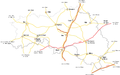 Le réseau routier comprend cinq catégories de voies : les autoroutes et routes nationales appartenant au domaine public routier national et gérées par l'État[14], les routes départementales appartenant au domaine public routier départemental et gérées par le Conseil général de l'Orne[15] et les voies communales[16] et chemins ruraux[17] appartenant respectivement aux domaines public et privé des communes et gérées par les municipalités. Le linéaire de routes par catégories peut évoluer avec la création de routes nouvelles ou par transferts de domanialité entre catégories par classement ou déclassement, lorsque les fonctionnalités de la route ne correspondent plus à celle attendues d'une route de la catégorie dans laquelle elle est classée. Ces transferts peuvent aussi résulter d'une démarche globale de transfert de compétences d'une collectivité vers une autre.