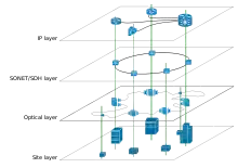 Un réseau IP utilisant des circuits virtuels ATM, eux-mêmes créés sur des liens SDH, eux-mêmes sur de la fibre noire, donne un exemple de réseau superposé.
