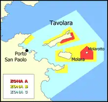 La zone A comprend, dans l'île de Tavolara, la zone située au sud de Cala di Levante, Punta del Papa et Punta del Passo Malo, et, dans l'île Molarotto, la zone marine environnante.