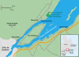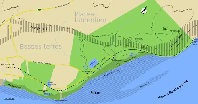 La réserve du cap Tourmente couvre 2 396 ha sur les berges de l'estuaire du Saint-Laurent à la rencontre des régions géologiques des basses terres du Saint-Laurent et du plateau laurentien[18]. La rencontre de l'escarpement du plateau et des premiers kilomètres de l'estuaire du fleuve provoque un microclimat où l'hiver est légèrement moins froid, mais plus humide que dans les régions avoisinantes et l'été plus frais[19]. On identifie quatre éléments géomorphologiques sur la réserve : la batture ou l'estran, la plaine, le plateau laurentien et, à la jonction du plateau et de la plaine, la zone de contact.