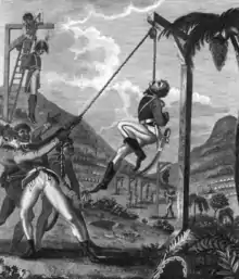 Ainsi, en Guadeloupe, une troupe de 3 500 militaires venus de France, commandée par le général Antoine Richepance, débarque le et se heurte rapidement à la résistance de plusieurs centaines de militaires locaux, parmi lesquels le chef de bataillon Louis Delgrès, qui déclare : « la résistance à l'oppression est un droit naturel »[72]. À partir du , Delgrès rassemble une partie des troupes de la colonie (comprenant des hommes nés « libres de couleur », des métis, des esclaves libérés à l'occasion de la Révolution, ainsi que quelques blancs) et entre en rébellion, tandis qu'une autre partie de la garnison (le chef de brigade Magloire Pélage à leur tête) se soumet à Richepance[72]. Après un repli de Pointe-à-Pitre au sud de la Basse-Terre, les hommes de Delgrès s'enferment le dans le fort Saint-Charles pour y mener un dernier combat[72], à l'issue de laquelle 300 révolutionnaires se réfugient au pied de la Soufrière, à Matouba (commune de Saint-Claude) et choisissent de se suicider en faisant sauter les barils de poudre le [73]. D'autres opposants à l'esclavage, guadeloupéens et haïtiens, sont déportés en Corse[74].