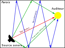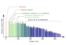 Lorsqu'on examine la réponse d'une salle à une impulsion, obtenue soit par un enregistrement direct, soit par l'analyse, on se rend compte que la réverbération se décompose en plusieurs phases. Après l'arrivée du son direct, des ondes qui ont rebondi une fois ou deux sur les parois arrivent après avoir parcouru un peu plus de chemin. En 1949, Helmut Haas a montré que ces réflexions, quand elles arrivent de 1 à 30 ms après le son direct, ne perturbent pas la perception de la direction d'origine du son, mais augmentent le volume sonore perçu[14]. Les réflexions latérales améliorent la dimension spatiale perçue de la source[15].