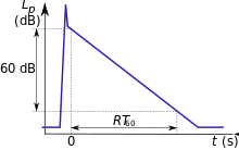 La première évaluation de la réverbération est l'indication du temps pendant lequel on perçoit du son après la disparition du son original, que l'on appelle excitation de la salle. Wallace Clement Sabine a effectué les premiers essais avec un tuyau d'orgue pour l'excitation et un chronomètre pour le temps de réverbération[5]. On a normalisé cette mesure subjective. Le temps de réverbération RT60 se définit comme le temps nécessaire pour que le son diminue de 60 dB par rapport au niveau sonore du son initial[6].