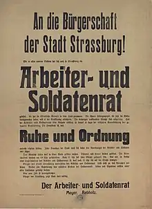 Affiche des conseils d'ouvriers et de soldats strasbourgeois appelant au calme et au maintien de l'ordre.