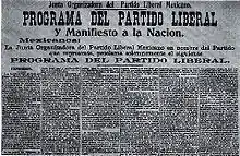 Le , les libéraux fondent le Parti libéral mexicain et, le , publient à Saint-Louis dans le Missouri leur « manifeste-programme »[39].