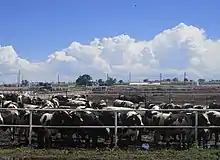 - au fait que le bétail n'est, dans bien des cas, plus nourri avec de l'herbe[1] ou du lin (naturellement riches en oméga-3, qui y représentent 65 % à 70 % des acides gras[17],[18]), mais au moyen de maïs et de soja (riches en oméga-6)[19],[20],[10],[16] (voire d'huile de palme[21]), surtout aux États-Unis et en Argentine où le bétail a presque déserté les prairies du Midwest et de la pampa pour se concentrer dans des parcs d'engraissement intensif appelés feed lots, que les Américains appellent également Concentrated animal feeding operations (CAFO)[22],[23] et les Canadiens Confined feeding operations (CFO) ;