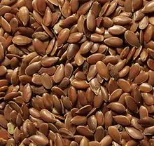 - lin : huile de lin (ratio oméga-6 / oméga-3 extrêmement favorable de 0,3 mais peu adaptée à la cuisine car risque de rancir[28]) et graines de lin[16],[1],[29],[30],[31],[32],[33],[34],[35],[12],[Notes 1] de préférence moulues[36],[37],[38],[Notes 2] ;