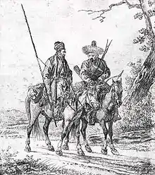 Illustration datée de 1814 représentant des cavaliers Bachkirs montés sur des chevaux de type Serko ou Amourski, petits chevaux asiatiques agiles, endurants et rapides convenant à la guerre de mouvement et de harcèlement menée par ce type de « cavalerie irrégulière ».