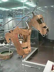 La cataphracte[Note 3] est l'une des premières armures couvrant presque entièrement le corps du cheval, elle est reconnaissable par ses lames de métal disposées en écailles. Leurs cavaliers, appelés cataphractaires, ont apporté cette solution pour combattre les archers à cheval des peuples des steppes.