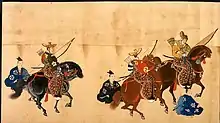Les samouraïs japonais se battent à cheval pendant de nombreux siècles[83], et sont particulièrement habiles dans l'art du tir à l'arc à cheval. L'art du combat à cheval est développé par des techniques d'entraînement comme le Yabusame, né en 530 et qui atteint son apogée sous Minamoto Yoritomo (1147-1199), durant l'époque de Kamakura[84]. Durant l'époque Sengoku (1467-1515), les samouraïs délaissent l'arc au profit de la lance. Les races de chevaux qu'ils utilisent sont celles de l'archipel japonais, qui semblent proches des chevaux mongols et du cheval de Przewalski : elles en ont gardé les caractéristiques, en particulier la petite taille[85].