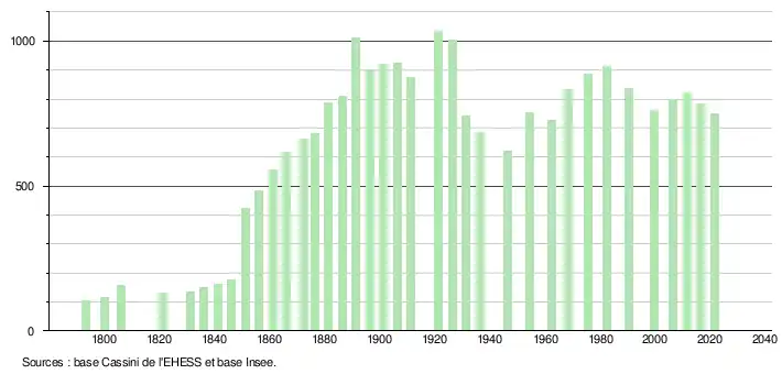 L'évolution du nombre d'habitants est connue à travers les recensements de la population effectués dans la commune depuis 1793. Pour les communes de moins de 10 000 habitants, une enquête de recensement portant sur toute la population est réalisée tous les cinq ans, les populations légales des années intermédiaires étant quant à elles estimées par interpolation ou extrapolation[16]. Pour la commune, le premier recensement exhaustif entrant dans le cadre du nouveau dispositif a été réalisé en 2006[17].