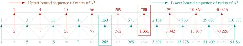 Comme dans toute fraction continue d’un nombre irrationnel, les approximations par défaut et par excès alternent indéfiniment dans la suite des meilleures approximations rationnelles de √3. En voici les neuf premiers termes :