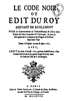 Dans le contexte de l'esclavage, le Code noir est le titre donné à l’Ordonnance royale ou Édit royal de mars 1685 touchant la police des îles de l'Amérique française de 1718, puis aux édits similaires de 1723 sur les Mascareignes et de 1724 sur la Louisiane, et enfin, à partir du milieu du XVIIIe siècle, aux recueils de textes juridiques relatifs aux territoires français d'outre-mer où l'esclavage était pratiqué. Cet ensemble de textes législatifs institutionnalise et marque du sceau de la légalité des pratiques de domination, d'exploitation et de ségrégation que l'esclavage avait fait émerger[D 3].