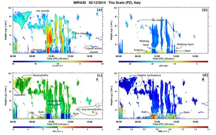 Les radars millimétriques ont révélé la complexité de la structure d'une grande variété de nuages. Les images ci-contre montrent le passage au-dessus du radar de multiples couches de nuages, y compris des stratus, des cirrus minces et de profond altocumulus, en plus de précipitations sous forme de bruine et de pluie. Chaque image donne une information différente qui permet de déterminer le type d'hydrométéores et l'état (solide ou liquide) des nuages[1],[15] :