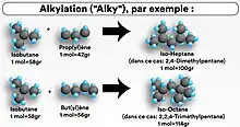 Les sous-produits du procédé RFCC sont des alcènes à chaîne courte (propylène, butylène) et des isoparaffines (isobutane), qui ne sont pas souhaitables. L'alkylation est utilisée pour convertir l'isobutane et les alcènes de faible poids moléculaire (principalement le propylène et le butylène) en alkylat, principalement l'isoheptane et l'isooctane. L'alkylate est un mélange d'essence de haute qualité car il possède de bonnes propriétés antidétonantes et brûle proprement.