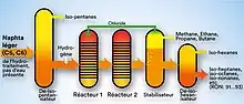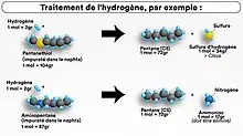 Dans ce procédé[31],[32], le naphta léger ou lourd provenant du CDU réagit avec de l'hydrogène en présence d'un catalyseur comme le cobalt-molybdène (ou le nickel-molybdène pour le pétrole brut à faible teneur en soufre) à des températures relativement élevées et à des pressions modérées. (Les conditions de réaction d'une unité d'hydrotraitement du naphta sont d'environ avec une pression de 25 à 45 bar[31]).