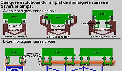 Le principe de base des montagnes russes, à travers les décennies, est demeuré pratiquement inchangé : un train qui, après avoir été tracté mécaniquement en haut de la plus grande côte, défile sur un tracé composé de bosses et de courbes vertigineuses, mû et successivement ralenti et accéléré par la force gravitationnelle terrestre (par l'énergie cinétique en descente et l'énergie potentielle en montée). À l'origine, les montagnes russes ne roulaient que sur des rails plats supportés par une structure de bois. Par la suite, sont apparus les manèges métalliques et les rails plats en acier.