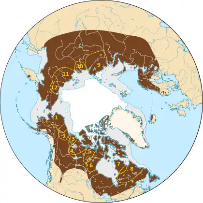 En Amérique du Nord, les plus anciens fossiles de caribou (Rangifer tarandus) datent de 50 000 ans[8]. L’espèce semblait alors abondante dans la taïga, à partir de la marge des glaciers jusqu’au Nouveau-Mexique. Les changements climatiques subséquents ont modifié considérablement l’aire de répartition du caribou. À l’arrivée des premiers Européens, on le retrouvait dans toutes les provinces canadiennes ainsi que dans la plupart des États américains limitrophes du Canada. Dans l’est du continent, il était présent dans les états de New York, du Vermont, du New Hampshire et du Maine[9]. Aujourd’hui, il est surtout présent au nord du 49e parallèle. Il subsiste aujourd'hui quatre sous-espèces de caribou en Amérique du Nord : le caribou de Peary (Rangifer tarandus pearyi), le caribou de Grant (Rangifer tarandus granti), le caribou de la toundra (Rangifer tarandus groenlandicus) et le caribou des bois (Rangifer tarandus caribou).