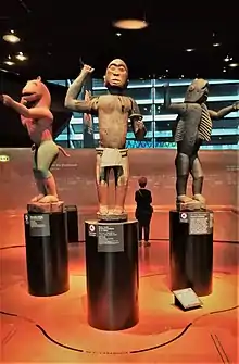 - The signboard next to the group of three statues from the royal palaces in Abomey, presented in May 2021, says in translation from the French original: "The President of the Republic Emmanuel Macron promulgated on December 24, 2020, the text of the law adopted by the National Assembly on December 17, 2020 for the restitution to the Republic of Benin of works taken by Colonel, then General Dodds in Abomey in 1892. This decision follows Benin's official request in July 2016. Notwithstanding the principle of inalienability of French public collections, these works cease to be part of the collection of the Musée du quai Branly-Jacques Chirac and become the property of the Republic of Benin. The return of works to Benin is currently being carried out in full collaboration with the authorities of the Republic of Benin."