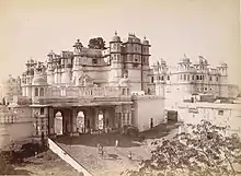 Palais, jardin et éléphant à Udaipur (Rajasthan), 1895.
