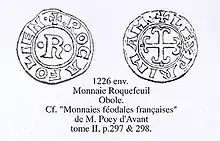 Raymond de Roquefeuil semble frapper de la monnaie, des deniers[17] et des oboles, mais ces derniers sont rares. L'atelier de Roquefeuil est situé à Sommières[18],[19].