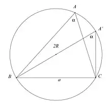 Pour calculer le rayon d'un cercle passant par trois points on peut utiliser la formule suivante (voir Théorème de l'angle inscrit, Angle inscrit dans un demi-cercle et la figure ci-contre) : , où est la longueur et la mesure de l'angle .