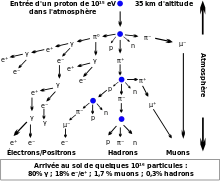 En 1938, l'astronome français Pierre Auger découvre que la pénétration des particules déclenche des gerbes atmosphériques constituées de particules dites « secondaires » — par opposition aux particules « primaires » constituant le flux avant son interaction avec l'atmosphère.