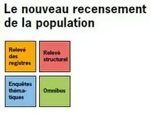 Le nouveau recensement de la population repose principalement sur un relevé fondé sur les registres qui exploite les données administratives disponibles. L’OFS utilise pour ce faire les données des registres des habitants des cantons et des communes, des registres fédéraux de personnes ainsi que du registre fédéral des bâtiments et des logements. Les informations nécessaires qui ne figurent dans aucun registre doivent être collectées à l'aide d'enquêtes complémentaires par échantillonnage (relevé structurel, enquêtes thématiques, enquête Omnibus).