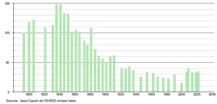 L'évolution du nombre d'habitants est connue à travers les recensements de la population effectués dans la commune depuis 1793. Pour les communes de moins de 10 000 habitants, une enquête de recensement portant sur toute la population est réalisée tous les cinq ans, les populations légales des années intermédiaires étant quant à elles estimées par interpolation ou extrapolation[17]. Pour la commune, le premier recensement exhaustif entrant dans le cadre du nouveau dispositif a été réalisé en 2008[18].