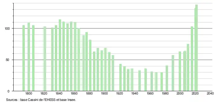 L'évolution du nombre d'habitants est connue à travers les recensements de la population effectués dans la commune depuis 1793. Pour les communes de moins de 10 000 habitants, une enquête de recensement portant sur toute la population est réalisée tous les cinq ans, les populations légales des années intermédiaires étant quant à elles estimées par interpolation ou extrapolation[14]. Pour la commune, le premier recensement exhaustif entrant dans le cadre du nouveau dispositif a été réalisé en 2005[15].
