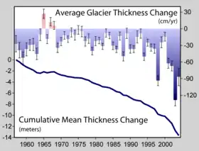 Le recul des glaciers depuis 1850, ou plutôt le « recul du front des glaciers[1] », est mondial et rapide ; il affecte l'accès à l'eau douce pour l'irrigation et pour l'utilisation domestique, les loisirs de montagne, les animaux et les plantes qui dépendent de la fonte des glaciers, et à plus long terme, le niveau des océans. Les montagnes à mi-latitude telles que l'Himalaya, les Alpes, les montagnes Rocheuses, la chaîne des Cascades et les Andes méridionales, aussi bien que les sommets tropicaux isolés tels que le Kilimandjaro en Afrique, montrent des pertes glaciaires proportionnées qui sont parmi les plus grandes[2],[3].
