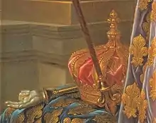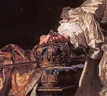 . Contrairement à ses trois prédécesseurs directs, Louis XVI est sacré à l'âge adulte de 21 ans, le . La couronne d'or fut réalisée par l'orfèvre du roi, Auguste, qui la réalisa en or de 22 carats (poids total de 1345 g) pour un peu plus de 4016 livres (plus 150 livres pour l'écrin de maroquinerie pour la couronne)[18]. La couronne d'or est formée d'un bandeau enrichi d'ornements, de pierres précieuses (non détaillées) et cerné de perles dorées, et surmontée de fleur-de-lys reliés par des ornements, dont s'échappaient des diadèmes (branches dont la forme évoque les diadèmes de lauriers antiques) en feuilles d'acanthe, sur lesquels se trouvent des perles. Les diadèmes se réunissent au sommet de la couronne pour former une sorte de chapiteau, sur lequel on trouve une double fleur-de-lys. Elle avait un bonnet intérieur cramoisi brodé d'or[21]. On la reconnaît derrière le roi sur le célèbre portrait d'Antoine-François Callet.