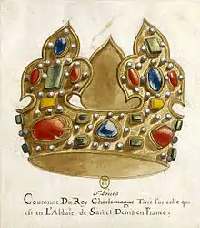 Le nombre de couronnes varia selon les règnes ; ainsi, Charles V disposait de 21 couronnes de roi, 5 couronnes de reines, 17 cercles de reines et de princesses, 5 chapels, 9 fleurons d'une couronne[4]. Ces couronnes n'étaient pas affectées au sacre et elles étaient parfois privées de pierres passées sur d'autres objets royaux ou liturgiques ; trois couronnes avait été faites par le roi Charles V dont une était un reliquaire et donc non destinée à être portée, une venait de son père Jean II comme chef de l'ordre de l'Étoile, un autre de Jeanne de Bourgogne, femme de Philippe VI[5].