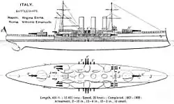 - Tous ces navires étaient des cuirassés pré-dreadnought, et étaient donc obsolètes à cette époque, mais le premier dreadnought d'Italie, Dante Alighieri, n'est pas entré en service avant 1913.[8]