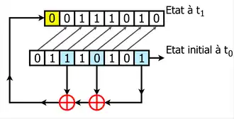 Il est dit de longueur « » lorsqu'il est composé de éléments appelés « étages » ou « cellules », le contenu de l'ensemble de ces éléments à un moment « » est l'état du LFSR à ce moment[2]. À chaque top d'horloge le contenu d'un étage est transféré au suivant et le premier est rempli par le résultat d'une fonction linéaire qui prend en compte l'état d'un ou de plusieurs étages[2].
