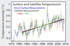 Pour la basse troposphère, UAH a trouvé une tendance mondiale moyenne depuis 1978 de 0,140 °C / décennie, jusqu'à janvier 2011[1]. RSS a trouvé 0,148 °C / décennie, jusqu'à janvier 2011[2].