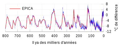 Les valeurs les plus récentes relevées avec des carottes de glace en Antarctique faite par l'EPICA atteignent 800 000 ans. Il existe quelques sites avec des valeurs encore plus anciennes; beaucoup d'autres atteignent plus de 100.000 ans. Le données de l'EPICA couvrent huit cycles glaciaires / interglaciaires. Les carottes provenant du NGRIP au Groenland couvrent plus de 100 000 ans, avec 5 000 dans la période interglaciaire Éémien. Alors que les signaux à grande échelle sont clairs, il y a des problèmes d'interprétation dans les détails particulièrement pour lier la variation isotopique au signal de température.