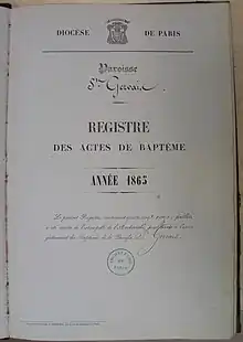 Depuis cette date, les registres paroissiaux sont considérés comme des archives privées de l'Église catholique. Ils sont parfois nommés registres de catholicité. Dans les diocèses, les séries actuelles de registres paroissiaux remontent parfois à 1795 pour les plus anciens. Généralement, les séries sont suivies depuis 1802-1803, époque du retour du culte concordataire. Les curés doivent toujours les établir en double exemplaire, l'un pour la paroisse, l'autre pour la chancellerie épiscopale. Dans certains cas, ils ont pu servir pour rétablir des actes officiels d'état civil, comme lors de la reconstitution des registres paroissiaux et d'état civil à Paris après l'incendie de 1871[14]. Les registres de catholicité sont conservés selon les cas aux archives diocésaines ou aux archives départementales.