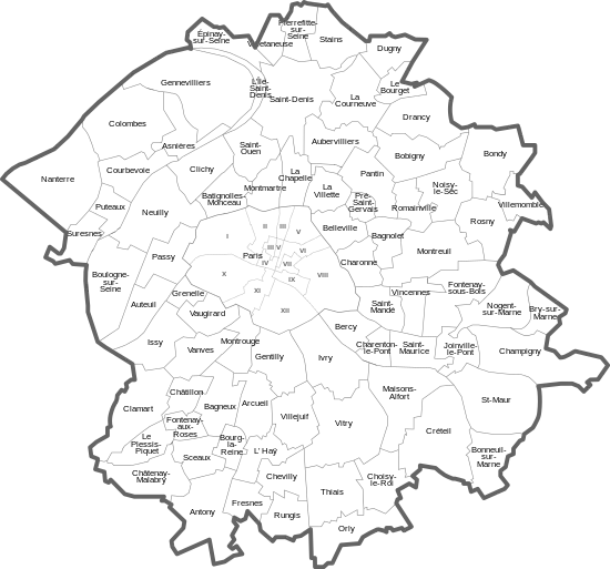 Par le décret du et la loi du 16 juin 1859, Napoléon III étend le territoire parisien jusqu'à l'Enceinte de Thiers[19]. Le , la ville passe de douze à vingt arrondissements. Elle absorbe, totalement ou en partie, certaines communes de la proche banlieue[20].