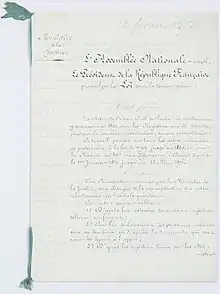 Par la loi du , l'Assemblée législative pose comme principe que les municipalités recevront et conserveront les actes de l'état civil[12]. En conséquence, elle vote le décret du 20 septembre 1792 qui crée l'état civil. À partir du , on confie aux maires le soin de rédiger, en double exemplaire, les actes de naissance, de mariage et de décès (titres I à V). Ce décret impose aussi à toutes les paroisses catholiques de déposer en mairie leurs registres paroissiaux depuis l'origine (titre VI). Il fait partie des derniers textes votés par l'Assemblée législative qui, dès le lendemain, laisse place à la Convention[13].