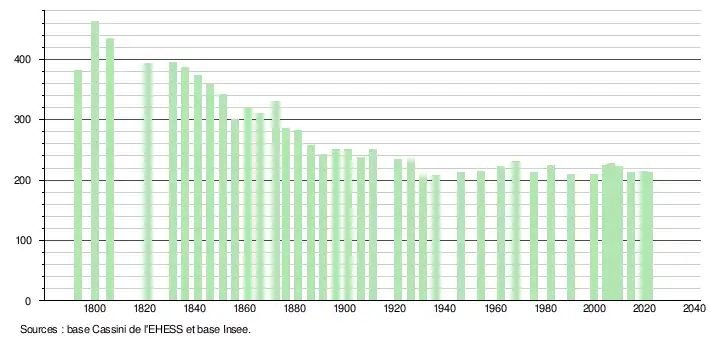 L'évolution du nombre d'habitants est connue à travers les recensements de la population effectués dans la commune depuis 1793. Pour les communes de moins de 10 000 habitants, une enquête de recensement portant sur toute la population est réalisée tous les cinq ans, les populations légales des années intermédiaires étant quant à elles estimées par interpolation ou extrapolation[32]. Pour la commune, le premier recensement exhaustif entrant dans le cadre du nouveau dispositif a été réalisé en 2004[33].