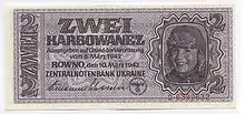Ainsi, le Commissariat était doté d'une banque centrale, la Banque centrale monétaire d'Ukraine (ZNU)[29], créée par décret le ; cet institut d'émission de monnaie est placé sous le contrôle de fonctionnaires de la Reichsbank. Ainsi, cette nouvelle banque centrale émet une monnaie nationale, le karbowanez, qui remplace le rouble[30].