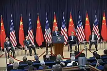 Le vice-président américain Joe Biden devant des officiels chinois au département d'État en 2013 pour le Dialogue stratégique et économique États-Unis-Chine.